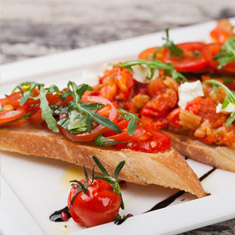 Freshly baked Bruschetta bread is topped with Mozzarella cheese, tomato, basil and a choice of grilled chicken strips or fresh veggies, topped with balsamic vinaigrette.